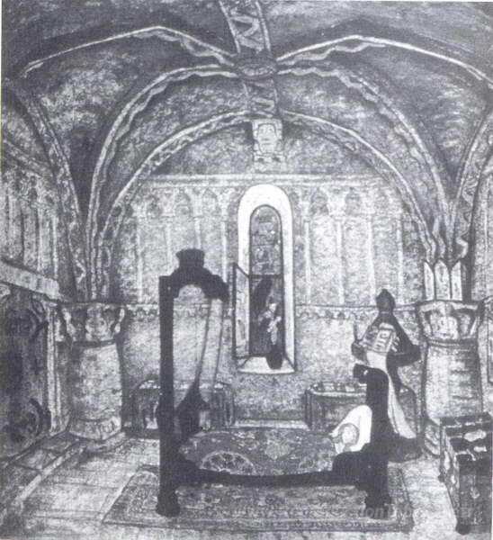 Nous vous proposons une reproduction artisanale sur toile du célèbre tableau 'Chambre de mâle' de Nicholas Roerich, provenant du Musée de la Reproduction.