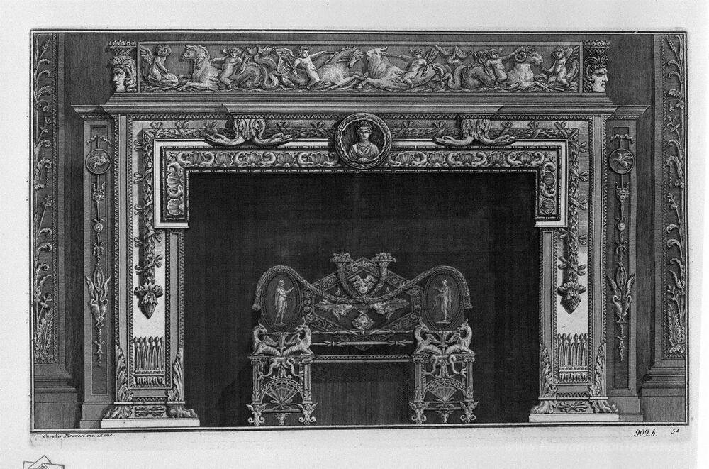 Nous vous proposons une reproduction artisanale sur toile du célèbre tableau 'Cheminée qui a un deuxième étage sur la frise des dauphins et de' de Giovanni Battista Piranesi, provenant du Musée de la Reproduction.