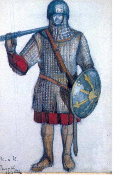 Nous vous proposons une reproduction artisanale sur toile du célèbre tableau 'Chevalier de l'entourage' de Nicholas Roerich, provenant du Musée de la Reproduction.
