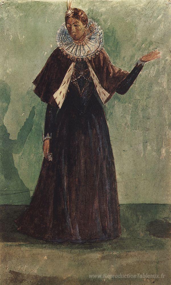 Nous vous proposons une reproduction artisanale sur toile du célèbre tableau 'Conception de costumes par Marina Mnishek à la tragédie de Boris' de Kuzma Petrov-Vodkin, provenant du Musée de la Reproduction.