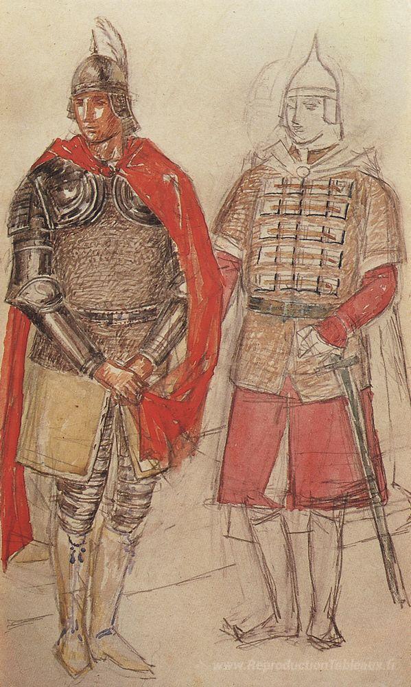 Nous vous proposons une reproduction artisanale sur toile du célèbre tableau 'Conception de costumes pour la tragédie de Boris Godunov de Pouc' de Kuzma Petrov-Vodkin, provenant du Musée de la Reproduction.