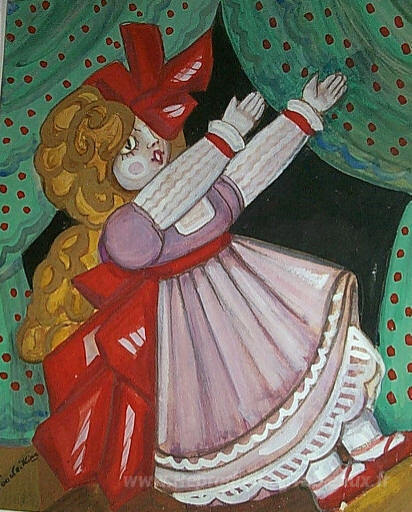 Nous vous proposons une reproduction artisanale sur toile du célèbre tableau 'Conception de rideaux avec poupée' de Serge Sudeikin, provenant du Musée de la Reproduction.
