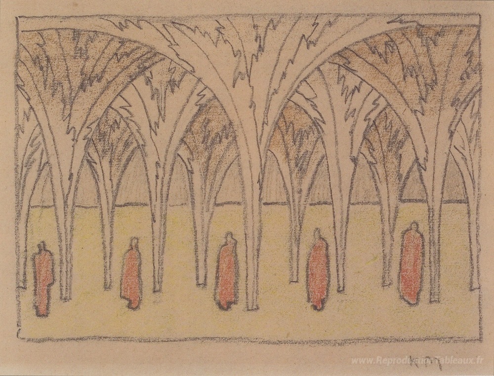 Nous vous proposons une reproduction artisanale sur toile du célèbre tableau 'Conception de scène pour «le lac» de Julius Bittner' de Koloman Moser, provenant du Musée de la Reproduction.