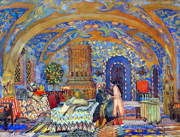 Nous vous proposons une reproduction artisanale sur toile du célèbre tableau 'Conception de scène pour l'opéra de Mussorgsky 'Boris Godunov'' de Konstantin Yuon, provenant du Musée de la Reproduction.