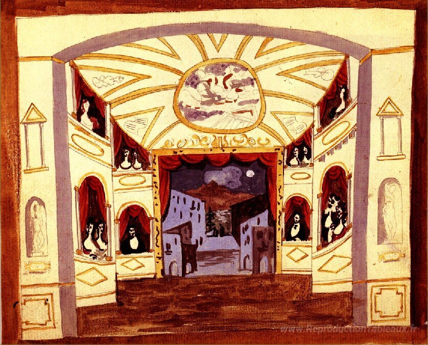 Nous vous proposons une reproduction artisanale sur toile du célèbre tableau 'Conception de scène pour "Pulcinella"' de Pablo Picasso, provenant du Musée de la Reproduction.