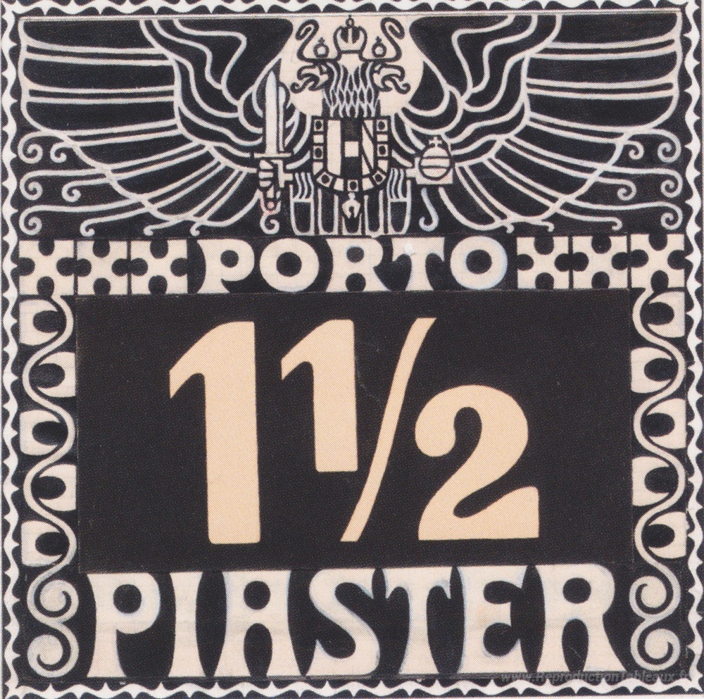 Nous vous proposons une reproduction artisanale sur toile du célèbre tableau 'Conception du 1102 Piasstres Porto Brand de poste autrichien dan' de Koloman Moser, provenant du Musée de la Reproduction.