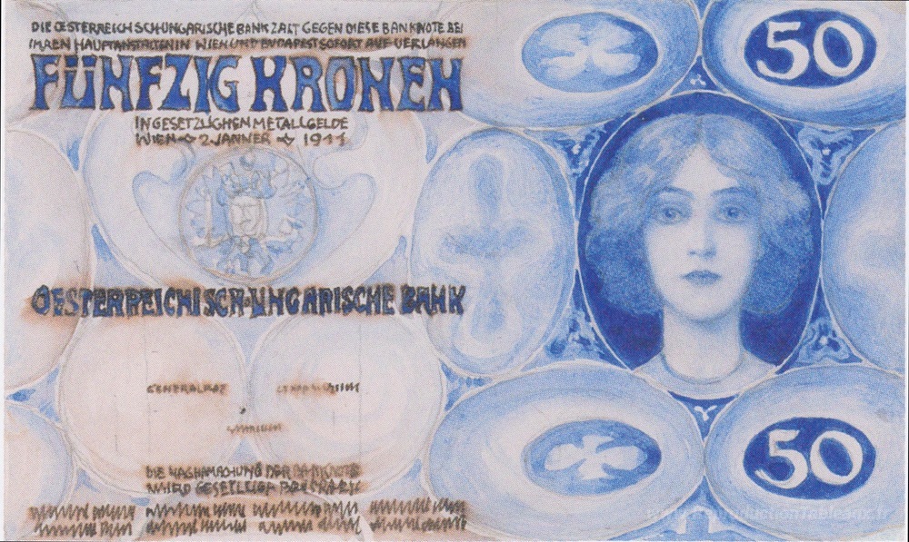 Nous vous proposons une reproduction artisanale sur toile du célèbre tableau 'Conception pour le projet de loi de 50 couronnes' de Koloman Moser, provenant du Musée de la Reproduction.