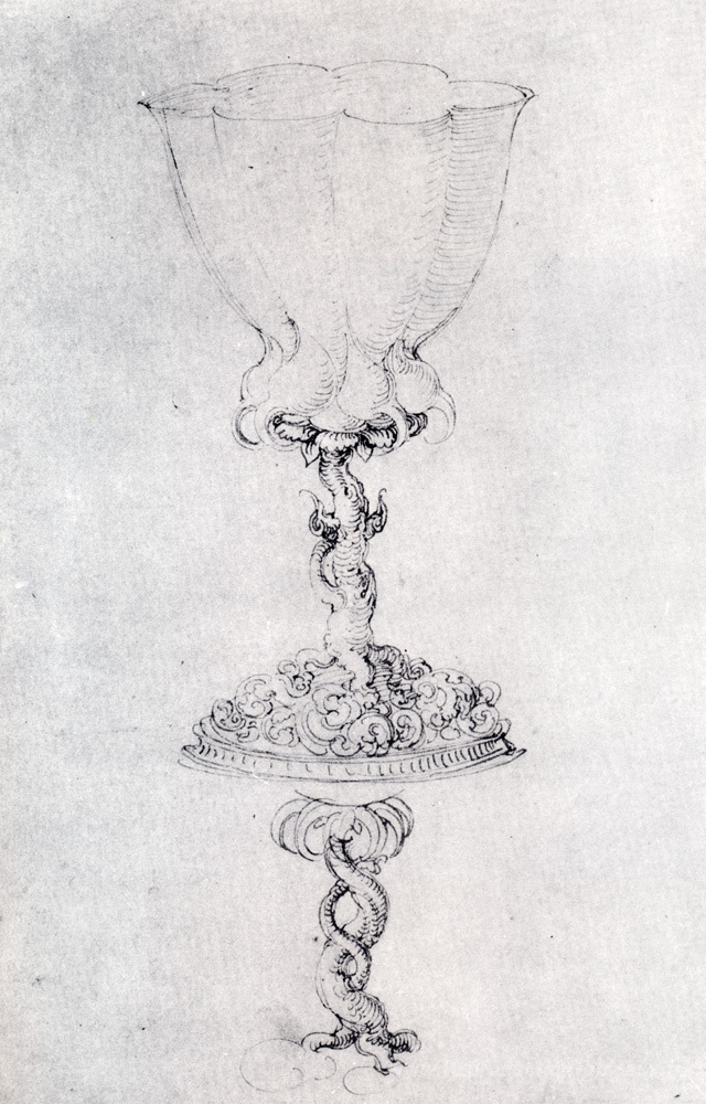 Nous vous proposons une reproduction artisanale sur toile du célèbre tableau 'Conception pour un gobelet, avec une variante de la base' de Albrecht Durer, provenant du Musée de la Reproduction.