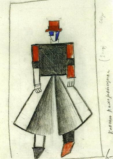 Nous vous proposons une reproduction artisanale sur toile du célèbre tableau 'Costume pour la victoire sur le soleil. Artiste funéraire' de Kazimir Malevich, provenant du Musée de la Reproduction.
