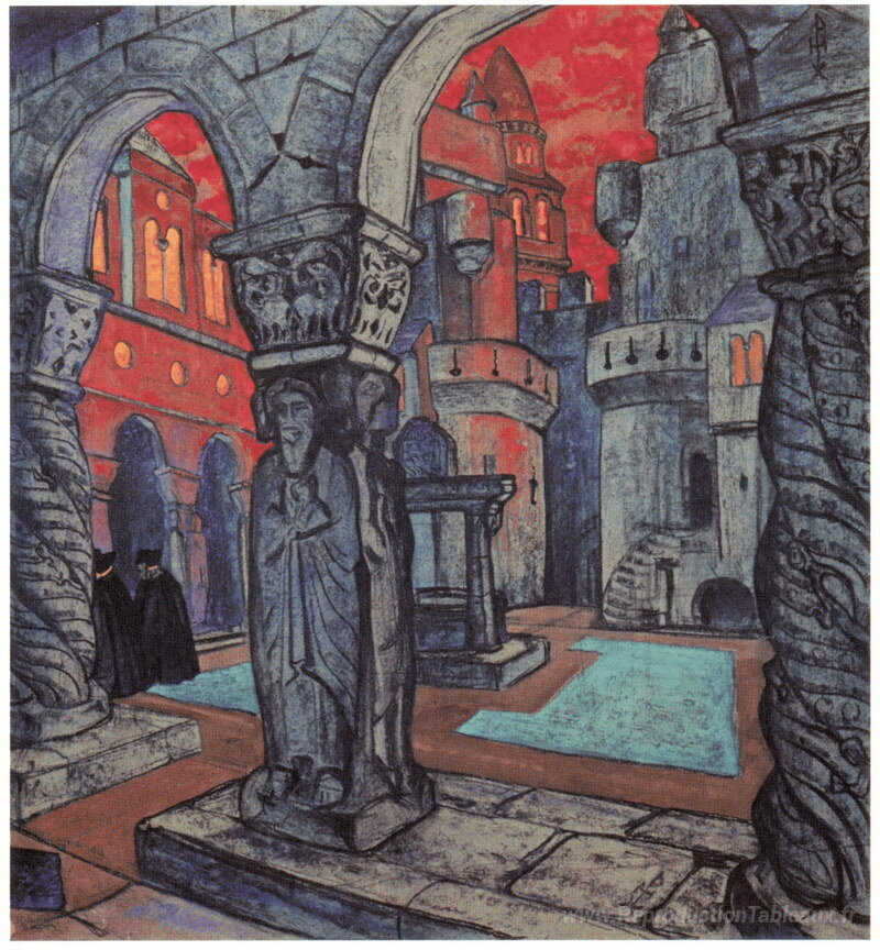 Nous vous proposons une reproduction artisanale sur toile du célèbre tableau 'Cour du château' de Nicholas Roerich, provenant du Musée de la Reproduction.