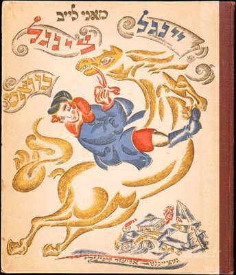 Nous vous proposons une reproduction artisanale sur toile du célèbre tableau 'Couverture de livre pour «Ingle-tsingl-khvat» par Mani Leib' de El Lissitzky, provenant du Musée de la Reproduction.