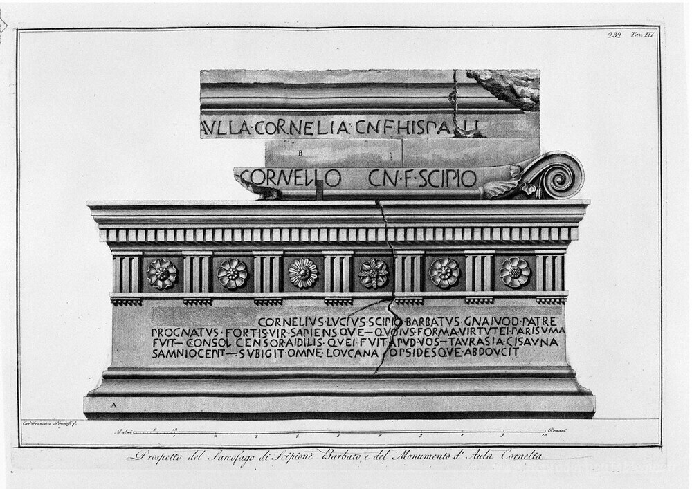 Nous vous proposons une reproduction artisanale sur toile du célèbre tableau 'Déclaration du sarcophage de Scipio Barbato et du monument de Co' de Giovanni Battista Piranesi, provenant du Musée de la Reproduction.