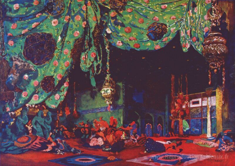 Nous vous proposons une reproduction artisanale sur toile du célèbre tableau 'Définir le design pour Scheherazade' de Leon Bakst, provenant du Musée de la Reproduction.