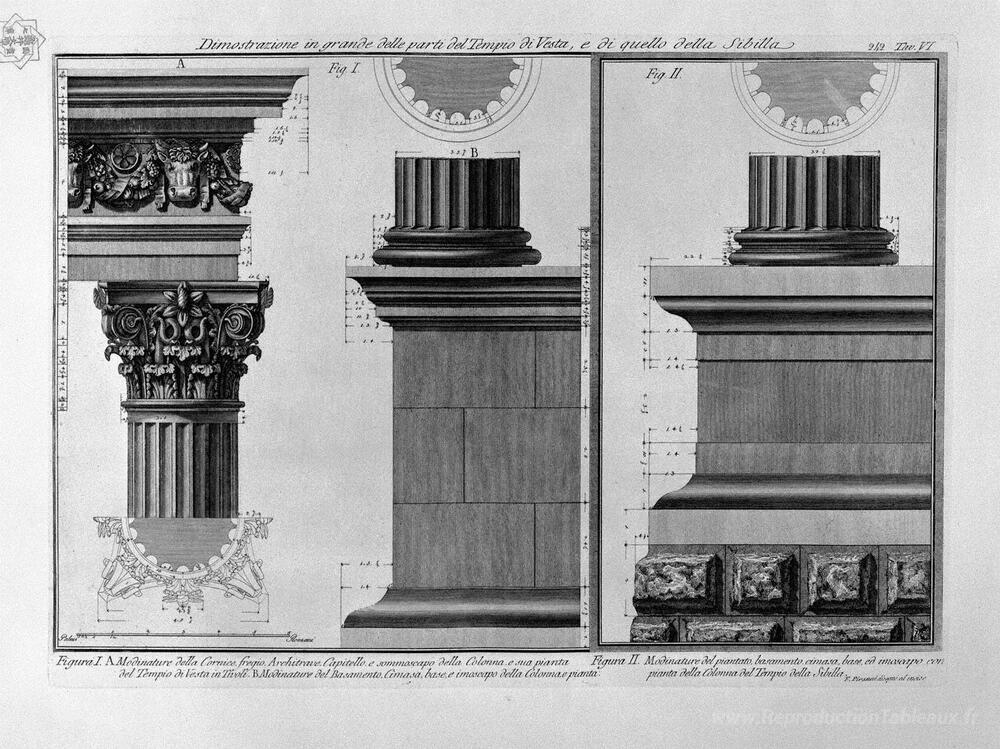 Nous vous proposons une reproduction artisanale sur toile du célèbre tableau 'Démonstration en grandes parties du temple de Vesta et de la Sib' de Giovanni Battista Piranesi, provenant du Musée de la Reproduction.