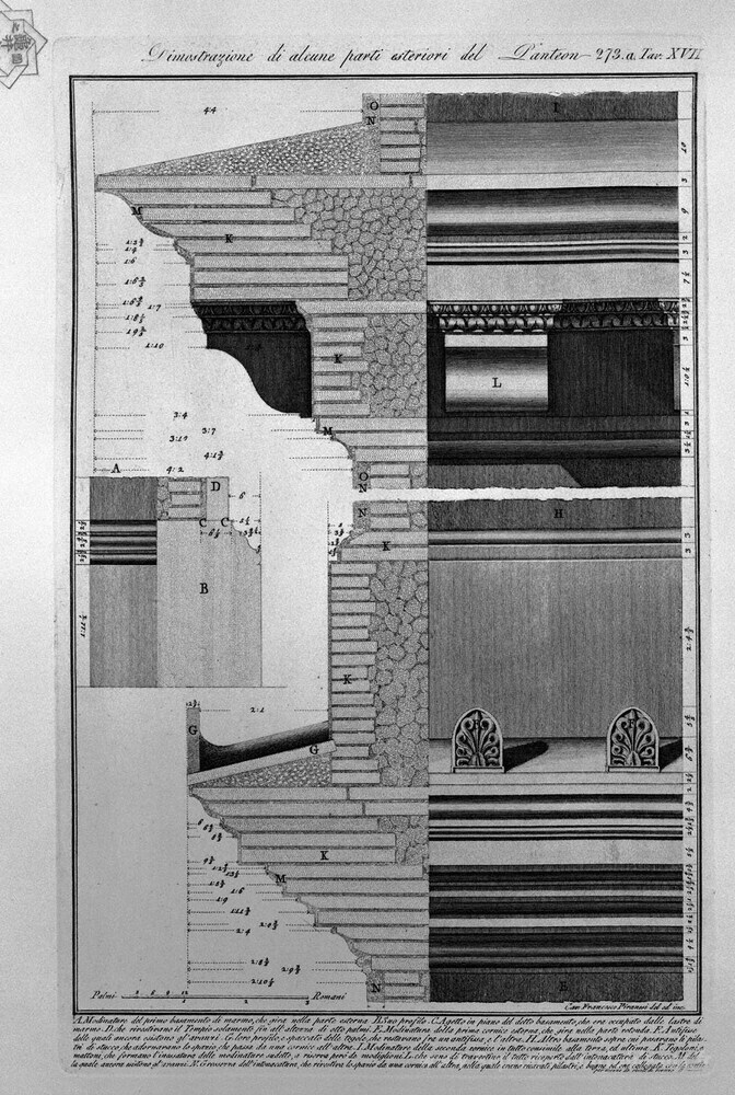 Nous vous proposons une reproduction artisanale sur toile du célèbre tableau 'Démonstrations de certaines parties externes du panthéon' de Giovanni Battista Piranesi, provenant du Musée de la Reproduction.