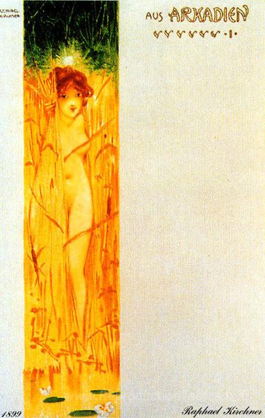 Nous vous proposons une reproduction artisanale sur toile du célèbre tableau 'D'Arcadia' de Raphael Kirchner, provenant du Musée de la Reproduction.