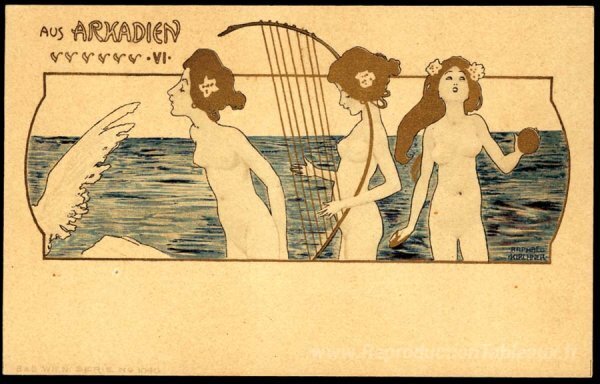 Nous vous proposons une reproduction artisanale sur toile du célèbre tableau 'D'Arcadia' de Raphael Kirchner, provenant du Musée de la Reproduction.