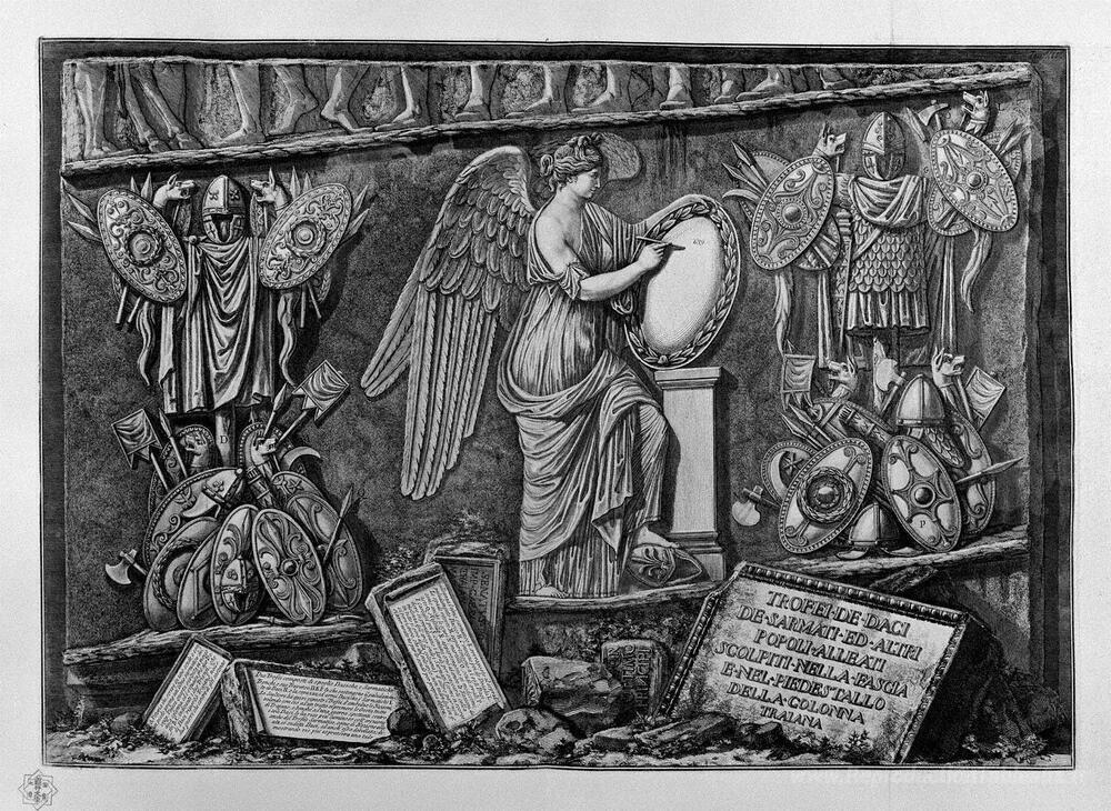Nous vous proposons une reproduction artisanale sur toile du célèbre tableau 'Des trophées des Dacians, des Sarmatiens et d'autres peuples des' de Giovanni Battista Piranesi, provenant du Musée de la Reproduction.