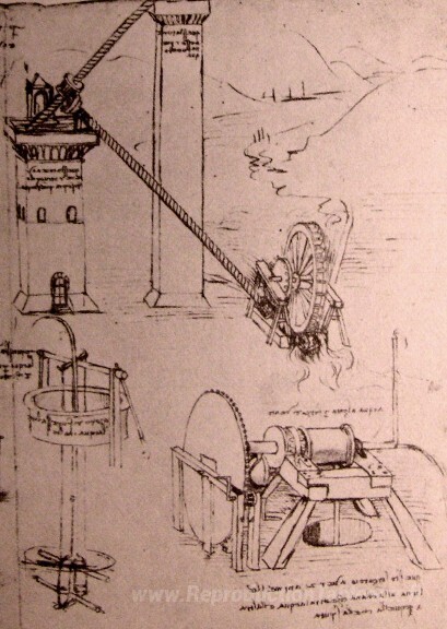 Nous vous proposons une reproduction artisanale sur toile du célèbre tableau 'Dessins de machines' de Leonardo da Vinci, provenant du Musée de la Reproduction.