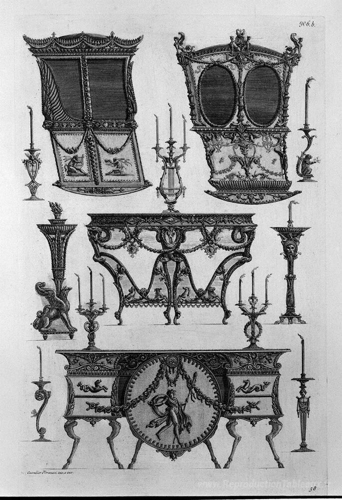 Nous vous proposons une reproduction artisanale sur toile du célèbre tableau 'Deux côtés des chaises de berline, deux tables au mur, neuf lust' de Giovanni Battista Piranesi, provenant du Musée de la Reproduction.