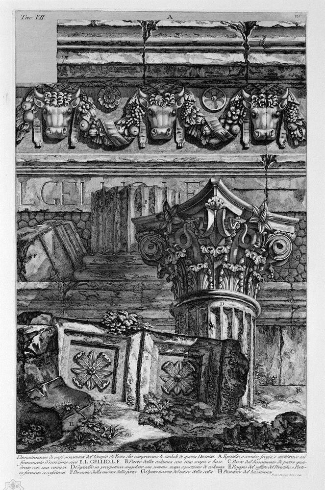 Nous vous proposons une reproduction artisanale sur toile du célèbre tableau 'Dimostazion divers ornements du temple de Vesta' de Giovanni Battista Piranesi, provenant du Musée de la Reproduction.