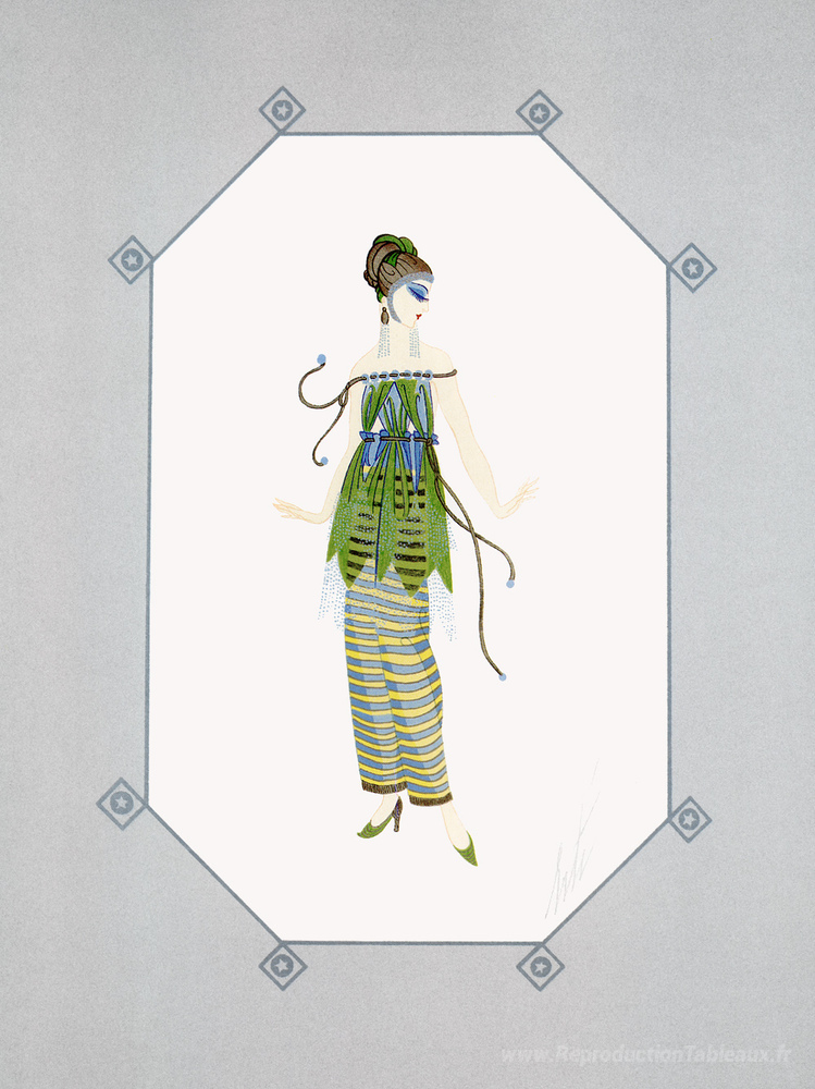 Nous vous proposons une reproduction artisanale sur toile du célèbre tableau 'Dinarade' de Erte, provenant du Musée de la Reproduction.