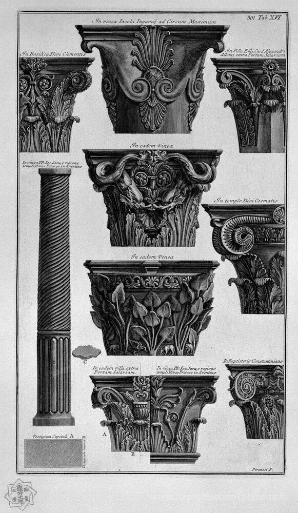 Nous vous proposons une reproduction artisanale sur toile du célèbre tableau 'Diverses capitales, colonne (Villa Albani, St. Clement, St. Cosm' de Giovanni Battista Piranesi, provenant du Musée de la Reproduction.