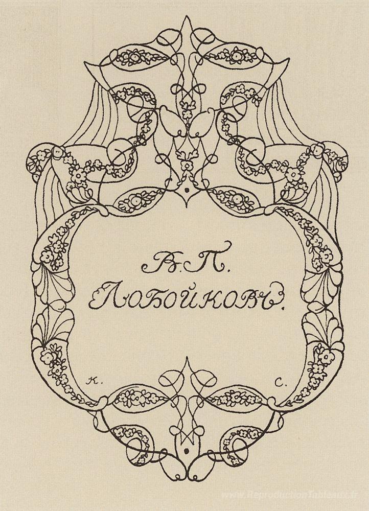 Nous vous proposons une reproduction artisanale sur toile du célèbre tableau 'Exlibris de V. Loboykov' de Konstantin Somov, provenant du Musée de la Reproduction.
