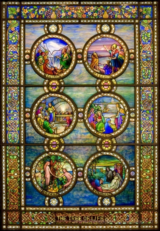 Nous vous proposons une reproduction artisanale sur toile du célèbre tableau 'Fenêtre d'arbre de vie' de Louis Comfort Tiffany, provenant du Musée de la Reproduction.