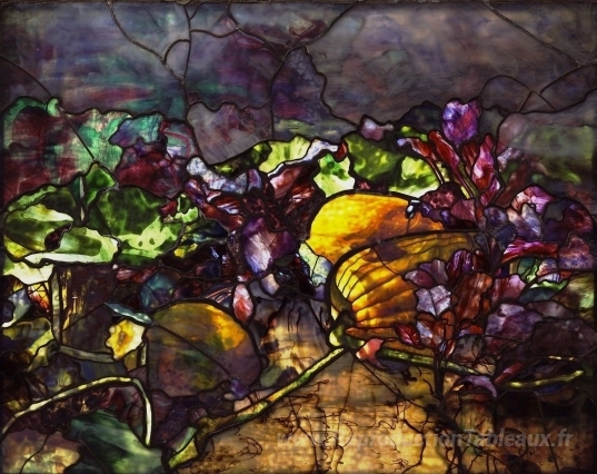 Nous vous proposons une reproduction artisanale sur toile du célèbre tableau 'Fenêtre de citrouille et de betteraves' de Louis Comfort Tiffany, provenant du Musée de la Reproduction.
