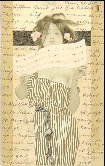 Nous vous proposons une reproduction artisanale sur toile du célèbre tableau 'Filles entre les frontières brunes-vert' de Raphael Kirchner, provenant du Musée de la Reproduction.