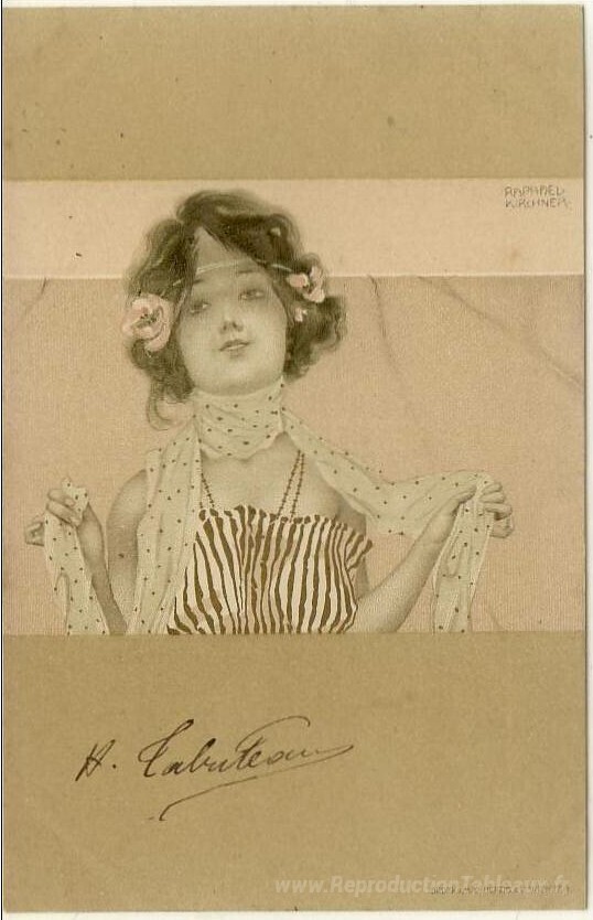 Nous vous proposons une reproduction artisanale sur toile du célèbre tableau 'Filles entre les frontières brunes-vert' de Raphael Kirchner, provenant du Musée de la Reproduction.