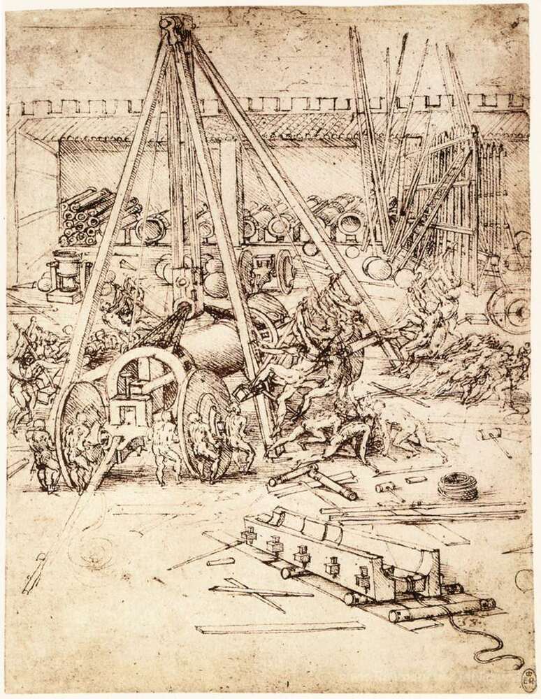 Nous vous proposons une reproduction artisanale sur toile du célèbre tableau 'Fonderie de canon' de Leonardo da Vinci, provenant du Musée de la Reproduction.