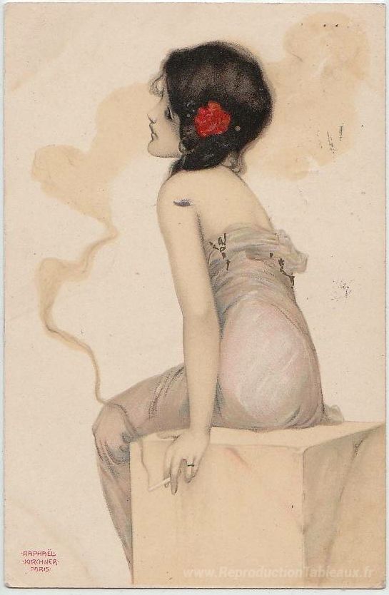 Nous vous proposons une reproduction artisanale sur toile du célèbre tableau 'Fumer les femmes' de Raphael Kirchner, provenant du Musée de la Reproduction.