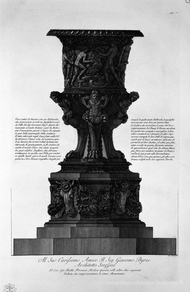Nous vous proposons une reproduction artisanale sur toile du célèbre tableau 'Grand vase ancien avec son piédestal en marbre trouvé à la villa' de Giovanni Battista Piranesi, provenant du Musée de la Reproduction.