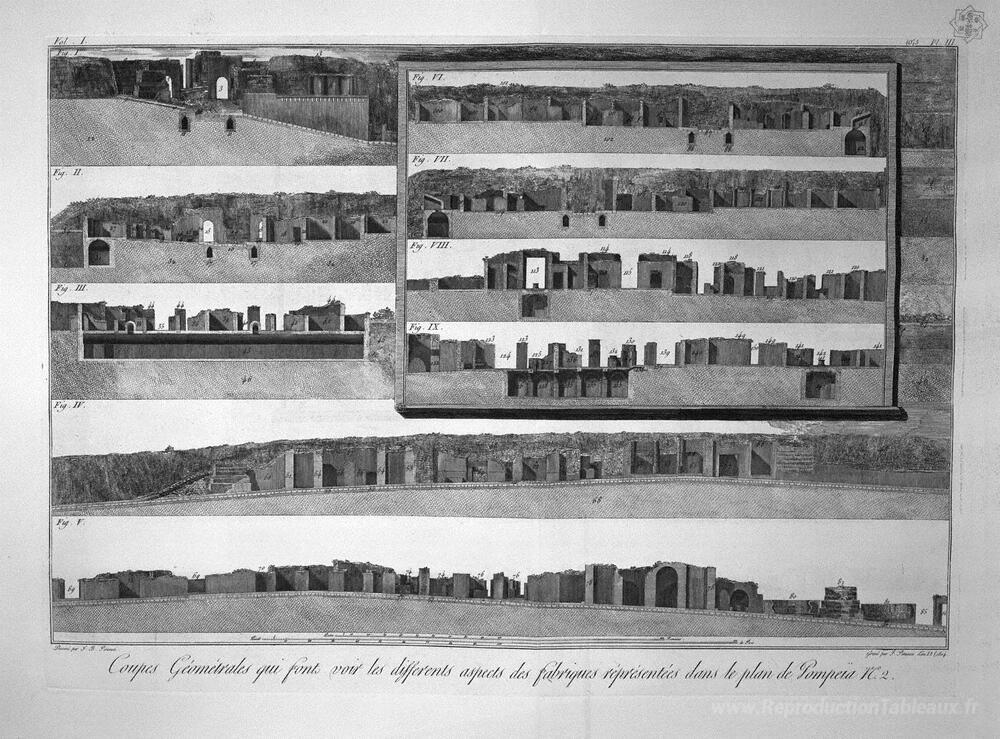 Nous vous proposons une reproduction artisanale sur toile du célèbre tableau 'Grande entrée végétale de la ville de Pompéi et des bâtiments en' de Giovanni Battista Piranesi, provenant du Musée de la Reproduction.