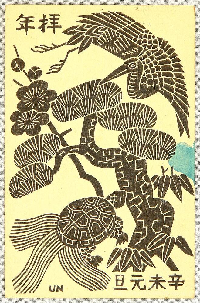 Nous vous proposons une reproduction artisanale sur toile du célèbre tableau 'Grane, tortue et pin - Carte de vœux du Nouvel An' de Unichi Hiratsuka, provenant du Musée de la Reproduction.