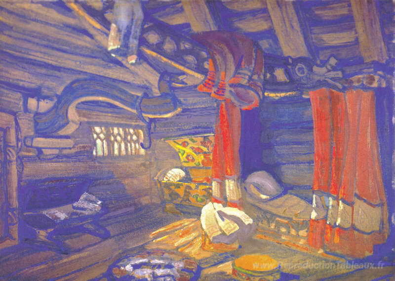 Nous vous proposons une reproduction artisanale sur toile du célèbre tableau 'Hut d'Oze' de Nicholas Roerich, provenant du Musée de la Reproduction.