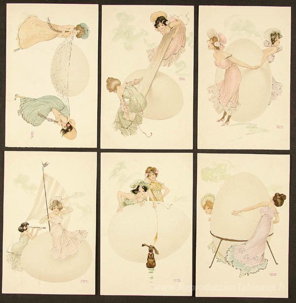 Nous vous proposons une reproduction artisanale sur toile du célèbre tableau 'Joyeuses Pâques' de Raphael Kirchner, provenant du Musée de la Reproduction.