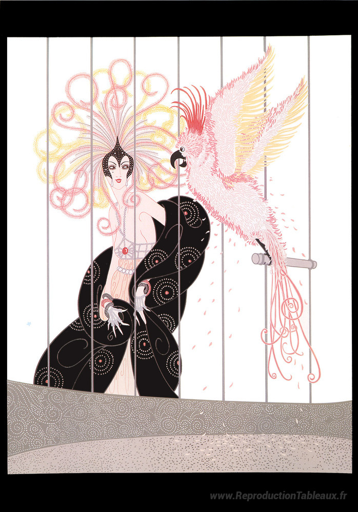 Nous vous proposons une reproduction artisanale sur toile du célèbre tableau 'La cage d'oiseau' de Erte, provenant du Musée de la Reproduction.