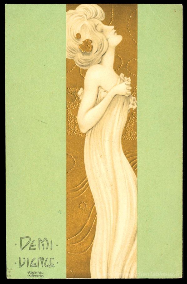 Nous vous proposons une reproduction artisanale sur toile du célèbre tableau 'La moitié d'une vierge' de Raphael Kirchner, provenant du Musée de la Reproduction.