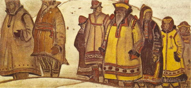 Nous vous proposons une reproduction artisanale sur toile du célèbre tableau 'La scène avec huit chiffres en costumes' de Nicholas Roerich, provenant du Musée de la Reproduction.