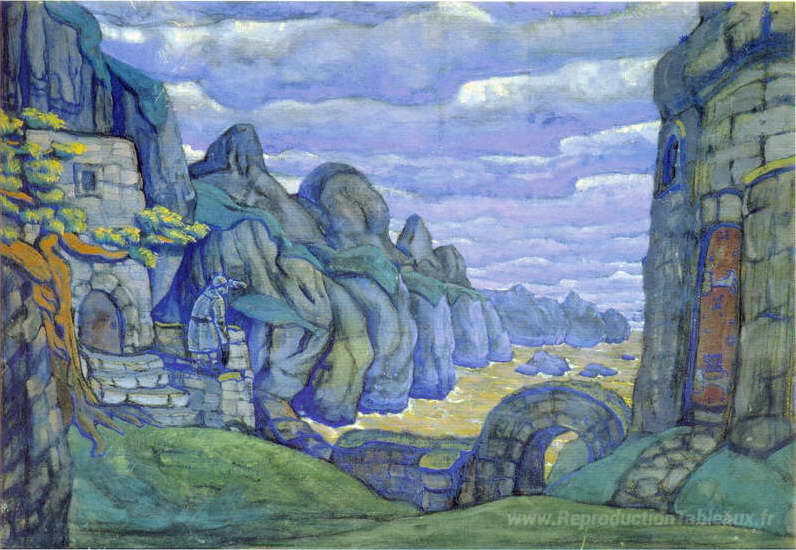 Nous vous proposons une reproduction artisanale sur toile du célèbre tableau 'Le château de Tristan en Bretagne' de Nicholas Roerich, provenant du Musée de la Reproduction.