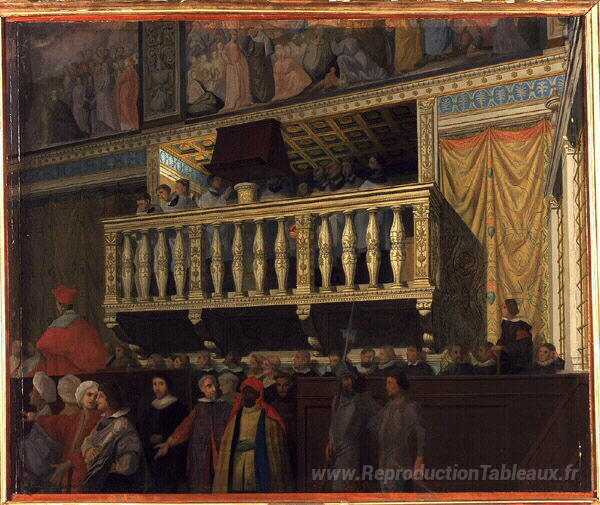 Nous vous proposons une reproduction artisanale sur toile du célèbre tableau 'Le chœur de la chapelle Sixtine' de Jean Auguste Dominique Ingres, provenant du Musée de la Reproduction.