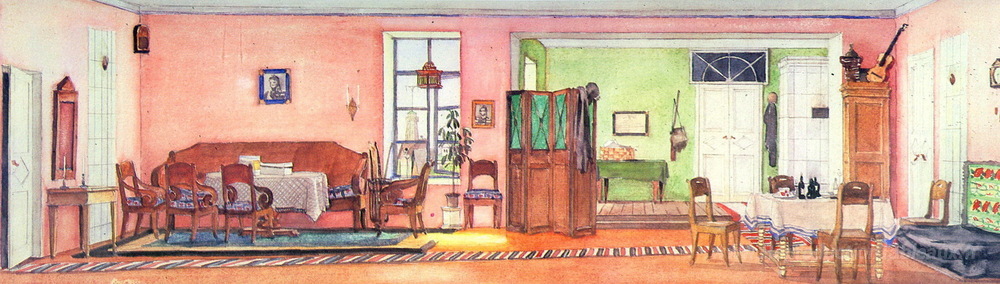 Nous vous proposons une reproduction artisanale sur toile du célèbre tableau 'Le croquis de la comédie de Gogol pour «l'inspecteur». Chambre d' de Konstantin Yuon, provenant du Musée de la Reproduction.