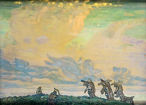 Nous vous proposons une reproduction artisanale sur toile du célèbre tableau 'Le grand sacrifice' de Nicholas Roerich, provenant du Musée de la Reproduction.
