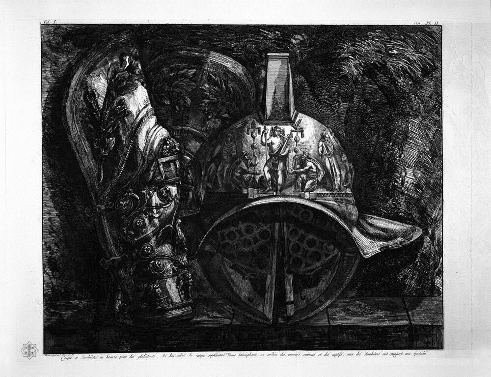 Nous vous proposons une reproduction artisanale sur toile du célèbre tableau 'Leggings de gladiateur de casque et de bronze' de Giovanni Battista Piranesi, provenant du Musée de la Reproduction.