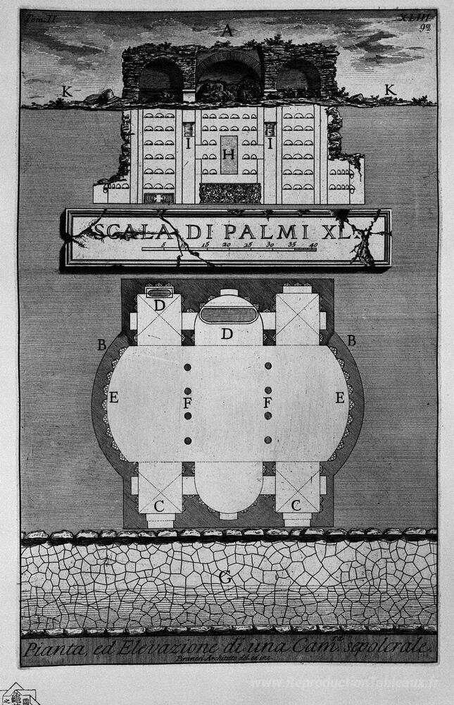 Nous vous proposons une reproduction artisanale sur toile du célèbre tableau 'Les antiquités romaines, t. 2, planche xliii. Plan et élévation ' de Giovanni Battista Piranesi, provenant du Musée de la Reproduction.
