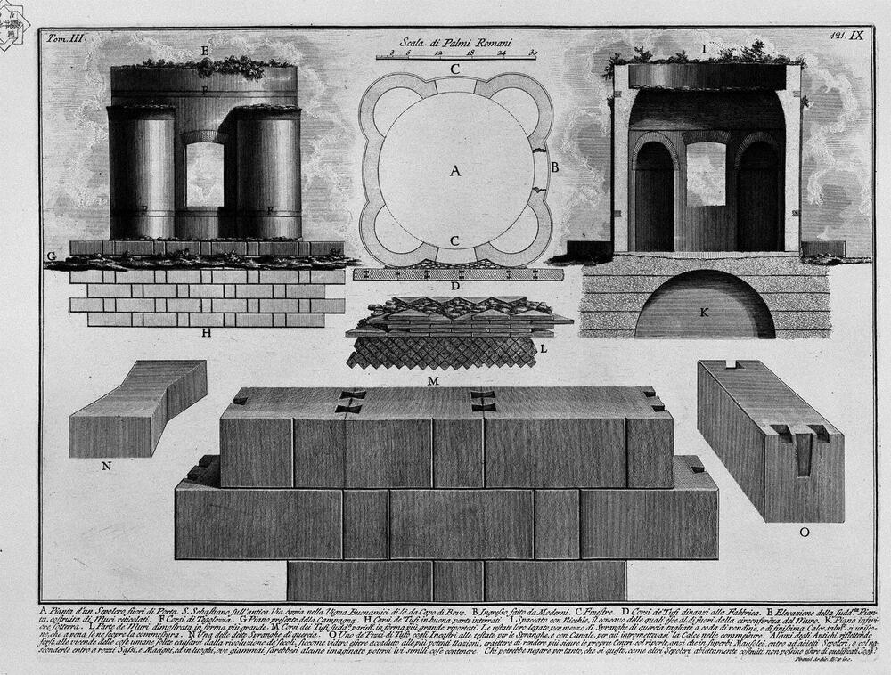 Nous vous proposons une reproduction artisanale sur toile du célèbre tableau 'Les antiquités romaines, t. 3, planche IX. Plan de la tombe à l'' de Giovanni Battista Piranesi, provenant du Musée de la Reproduction.