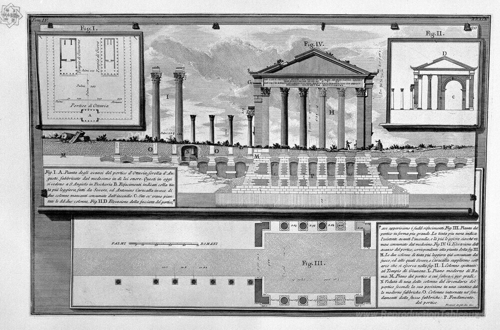 Nous vous proposons une reproduction artisanale sur toile du célèbre tableau 'Les antiquités romaines, t. 4, planche xxxix. Plans et élévation' de Giovanni Battista Piranesi, provenant du Musée de la Reproduction.